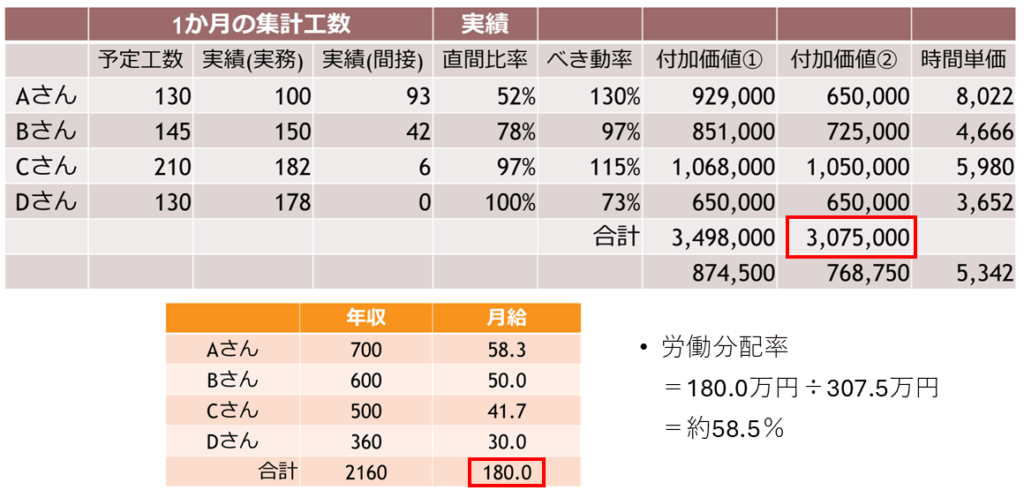この表では、個人ごとに稼いだ「付加価値額」や、計画工数に対する達成度を示す「べき動率」、そして貢献度を時給換算した「時間単価」が明確に示されています。