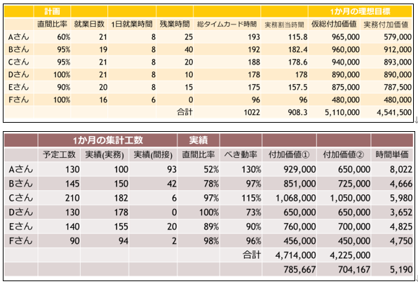 例えば、加工現場の事例で言いますと、下図の「1か月の集計工数」(実績)のような表がそれに当たります。