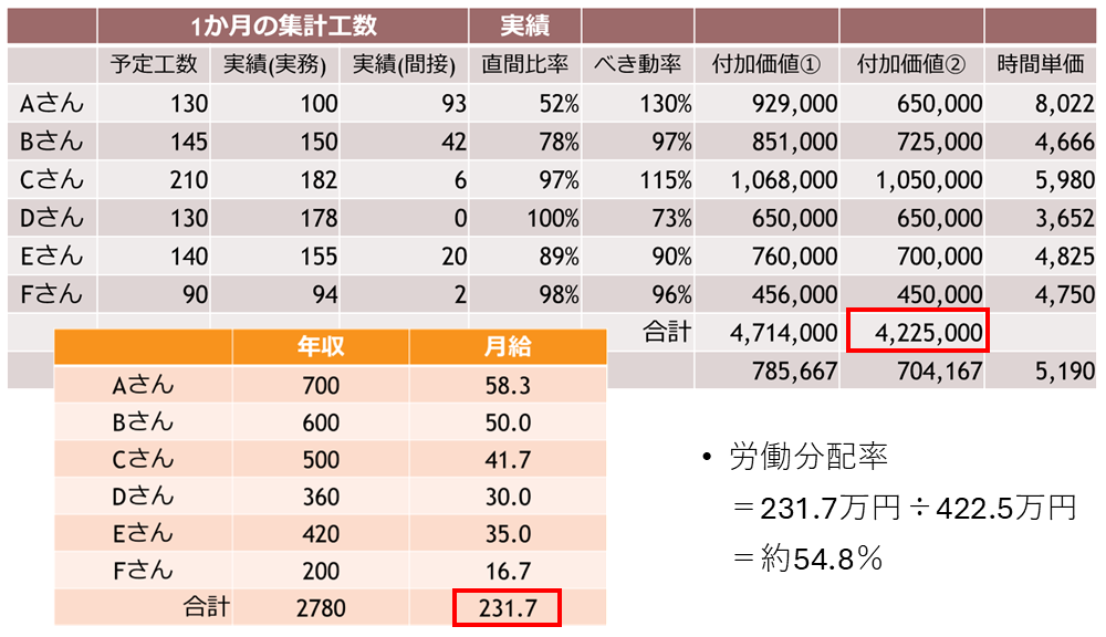 さらに、上の図の事例(4名)からメンバーが増え、6名になった下図の事例では、月給合計231.7万円に対し、付加価値額の合計(付加価値額②)が422.5万円で、労働分配率は約54.8%。こちらも黄色信号とはいえ、先ほどよりも効率的に分母の付加価値額を増やすことができ、労働分配率が改善されました。